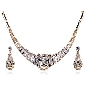 Gold Tone Emerald Eye Striped Tiger Swarovski Rhinestone Earring Necklace Set: Jewelry