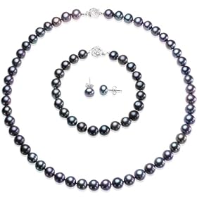 Enhanced Black 9-10mm AA Cultured Pearl Princess Necklace Strand 18", Bracelet & Earrings Platinum Overlay Sterling Silver Set: Dahlia: Jewelry