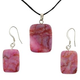 Pink Matrix Jasper Rectangle Shaped Pendant and Earrings Set - 17x22mm Pendant, 13x18mm Earrings - Adjustable Cord Necklace: Jewelry