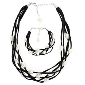 Layered Bobbi Leather Suede and Pearl Necklace and Bracelet Set in Black Suede with White pearls: Jewelry