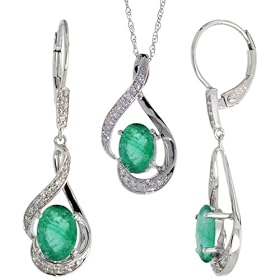 14k White Gold Dangle Earrings (19mm tall) & 18 in. Pendant-Necklace Set, w/ 0.20 Carat Brilliant Cut Diamonds & 3.64 Carats Oval Cut (7x5mm) Emerald Stones: Jewelry