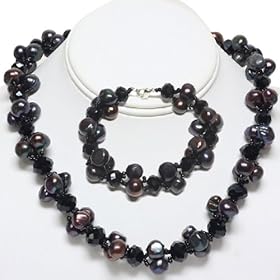 Pearl Freshwater Cultured Black Necklace Bracelet Dangle Earring Set 15 inches Silver Clasp Bucasi: Jewelry