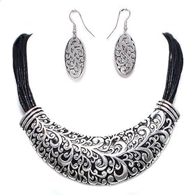 Fancy Chunky Multi Strand Black Cord Filigree Floral Design Statement Bib Necklace and Earrings Set Elegant Trendy Fashion Jewelry: Jewelry