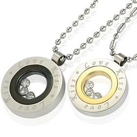 Floating Cubic Zirconia Stainless Steel Couples "Love Kiss" Medallion Pendant Necklace Set 18" and 20": Dahlia: Jewelry