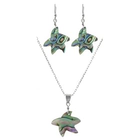 Sterling Silver Abalone Starfish-Shaped Drop Earrings and Pendant Set, 16": Jewelry