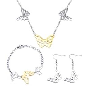 Stainless Steel Two Tone Butterfly Necklace, Bracelet and Earrings Set For Women (Necklace - 20", Bracelet - 7.5"): Jewelry