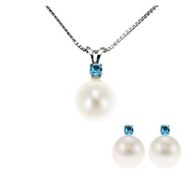 Sterling Silver White Button Freshwater Cultured Pearl and Blue Topaz 3 Piece Pendant Set (8-9mm Pearl, 2.5mm Gemstone), 18": Jewelry