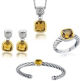 Sterling Silver Cushion Citrine and Diamond Ring, Pendant, Earring Box Set, Size 7: Jewelry