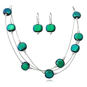 Sterling Silver Dichroic Glass Green with Blue Highlight Flat Round Bead Necklace and Earrings Set, 18": Jewelry