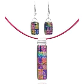 Sterling Silver Dichroic Glass Bezel-Set Pink, Yellow and Blue Rounded Rectangle Pendant and Earrings Set, 18": Jewelry