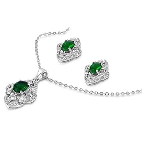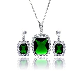 Sterling Silver & Emerald CZ Round Stone Over Diamond Shape Earring & Necklace Set: Jewelry