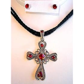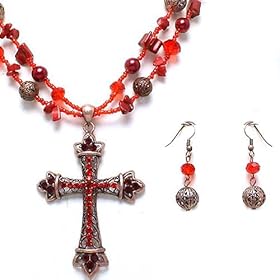 Fancy Chunky Antique Style Red Bead Copper Tone Cross Pendant Statement Necklace and Earrings Set Elegant Trendy Christian Religious Fashion Jewelry: Jewelry