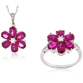 Sterling Silver Created Ruby, Created White Sapphire and Diamond Flower Ring and Pendant Set (0.045cttw, I-J Color, I2-I3 Clarity), 18": Jewelry