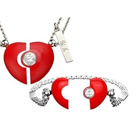 Sterling Silver Created Ruby and Diamond Heart Earring and Pendant Set, 18": Jewelry