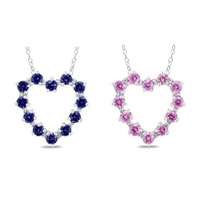 Sterling Silver Created Pink Sapphire, Created Sapphire and Diamond Heart Pendant Necklace Set, 18": Jewelry