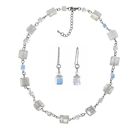 Necklace & Earring Set - N511 - Murano Style Glass Squares and Matching Earrings ~ Silvery White Iridescent: SERENITY CRYSTALS: Jewelry
