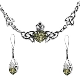 Baltic Green Amber and Sterling Silver Claddagh Dangling Earrings and Necklace Set, 18": Ian and Valeri Co.: Jewelry