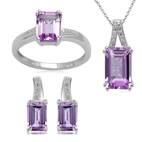 Sterling Silver Pear Amethyst Ring, Pendant Necklace and Earrings Diamond Box Set: Jewelry