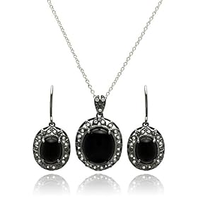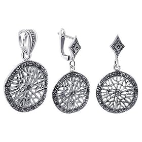 .925 Sterling Silver Dangle Earrings Pendant Jewelry Set with Marcasite Accented Filigree Design: Jewelry