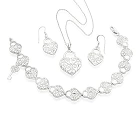 Sterling Silver Diamond Cut Heart Lock Bracelet, Earrings and Necklace Set: Jewelry