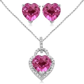 Sterling Silver Created Pink Sapphire and Diamond Heart Earring and Pendant Set, 18": Jewelry