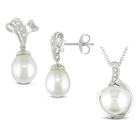 Sterling Silver 0.07 CT TDW Round Diamond White Freshwater Pearl Set Of Earring and Pendant(9-10mm): Jewelry