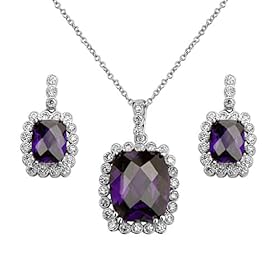 .925 Sterling Silver CZ Purple and White Checker Cut Earrings and Matching Pendant-Necklace Set with 1.2mm Cable Rolo Chain - 16"+1" Inches Extension: The World Jewelry Center: Jewelry