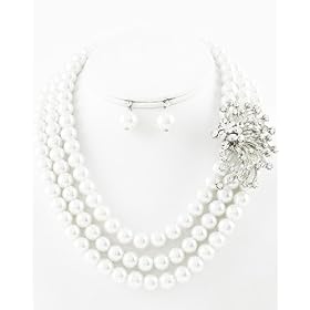 Multi Layer White Faux Glass Pearl Crystal Brooch Necklace Set: Jewelry