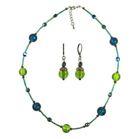 Necklace - Earrings Set - N310 - Murano & Glass Beads + Matching Earrings ~ Olive Green and Teal Blue: Jewelry