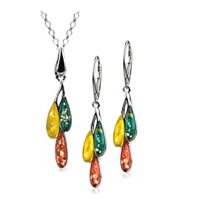 Honey Amber and Sterling Silver Dangling Style Filigree Pendant and Earrings Set, 18": Ian and Valeri Co.: Jewelry