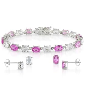 Sterling Silver 25 CT TGW Oval Created Pink Sapphire and White Topaz Stud Earrings Bracelet: Jewelry