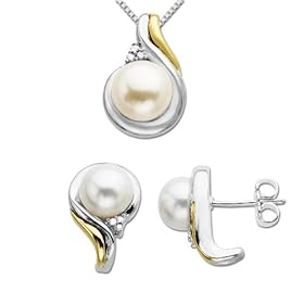 Sterling Silver and 14k Yellow Gold Freshwater Cultured Pearl and Diamond Pendant and Earring Set (0.03cttw, I-J Color, I3 Clarity), 18": Jewelry