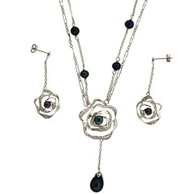 Silvertone Flower, Chain and Black Bead Necklace and Earrings Set Fashion Jewelry: Jewelry