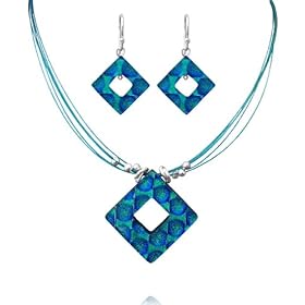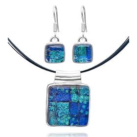 Sterling Silver Dichroic Glass Bezel-Set Blue and Green Mosaic Square-Shaped Pendant and Earrings Set, 18": Jewelry