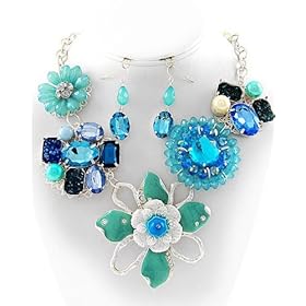 Matte Silvertone Blue Epoxy and Acrylic Flower Necklace and Earrings Set: Jewelry