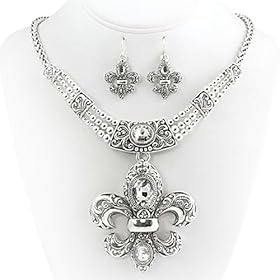 Silver Plated Fleur De Lis Statement Necklace and Earrings Set Fashion Jewelry: Jewelry