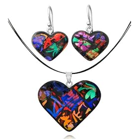 Sterling Silver Dichroic Glass Dark Multi-Colored Heart-Shaped Pendant and Earrings Set, 18": Jewelry