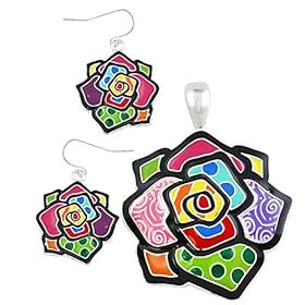 Multi Colored Epoxy Rose Pendant and Earrings Set: Jewelry