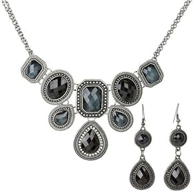 Statement Black Crystal and Faux Labradorite Pewter Tone Necklace and Drop Earring Set: Jewelry