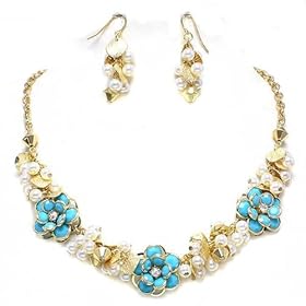 Elegant Classic Design Teal Turq Aqua Blue Flowers, Faux Simulated Pearls and Goldtone Beads Statement Necklace and Earrings Set Fashion Jewelry: Jewelry