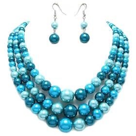 Fancy Chunky Multi Strand Aqua Blue Teal Faux Simulated Pearls Layered Statement Bib Necklace and Earrings Set Elegant Trendy Costume Fashion Jewelry: Jewelry