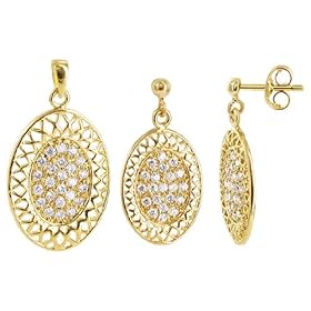 Gold Plated Oval Shaped Medallion Filigree and Pave Round Clear Cubic Zirconia Post Back Findings 13mm x 17mm Earrings and 17mm x 24mm Pendant Jewelry Set: Jewelry