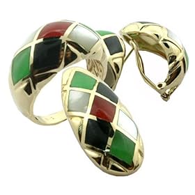 Multi-Colored Jade and Mother Of Pearl Diamond Back Earring, Ring and Pendant Set, 14k Gold: Jewelry