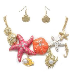 Fancy Chunky Gold Tone Large Pink and Orange Starfish Seashell Sea Life Ocean Fantasy Statement Necklace and Earrings Set Elegant Trendy Fashion Jewelry: Jewelry