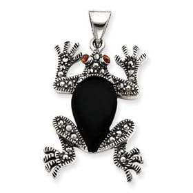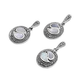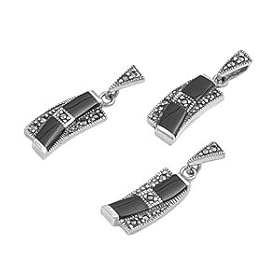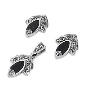 Sterling Silver & Marquise Onyx Marcasite Tip Vintage Style Earring & Pendant Set: Jewelry
