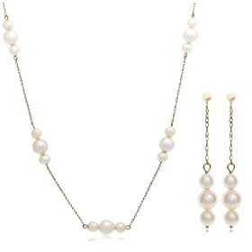 14k Yellow Gold Freshwater Cultured Pearl Dangle Earrings and Necklace Set: Jewelry
