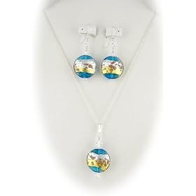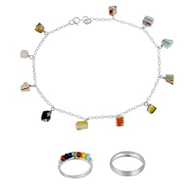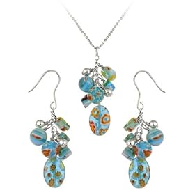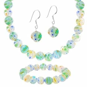 Sterling Silver Murano Glass Green, Yellow ,Blue, and White Beaded Millefiori Bracelet Earrings and Necklace Jewelry Set: Jewelry