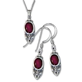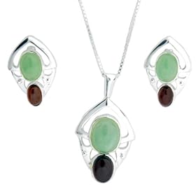 Sterling Silver Genuine Jade and Garnet Earrings, Necklace, and Pendant Set: Jewelry