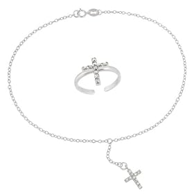 Sterling Silver Toe Ring and Chain Anklet with Cubic Zirconia Cross Drop, 10": Jewelry