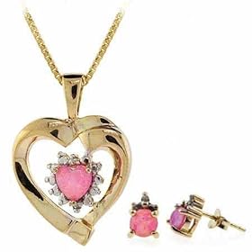 Vermeil (24k Gold over Sterling Silver) Genuine Diamond Accent and Simulated Pink Opal Heart and Earring Set: Jewelry